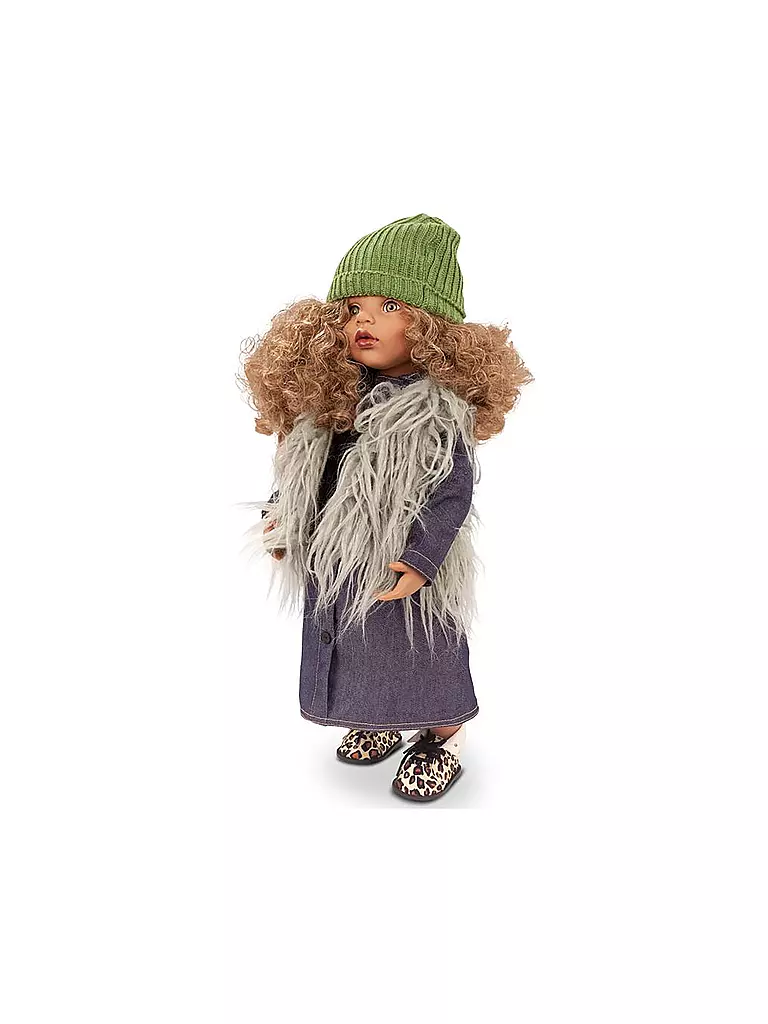 Lea ist Trendsetterin und liebt es ihre fein gesträhnten Locken in Szene zu setzen, denn darauf ist sie mächtig stolz auch wenn diese etwas mehr Pflege benötigen. Heute trägt sie ihren Denim-2Teiler mit langem Rock und Blazer, dazu Booties mit Leo-Print und der ausgefallenen Zottel-Plüschweste. Man muss zugeben Leas Style hat schon was. Nun noch die grüne Strickmütze, die ihre Mähne versucht zu bändigen, und los geht’s, eine Runde durch die Stadt bummeln.