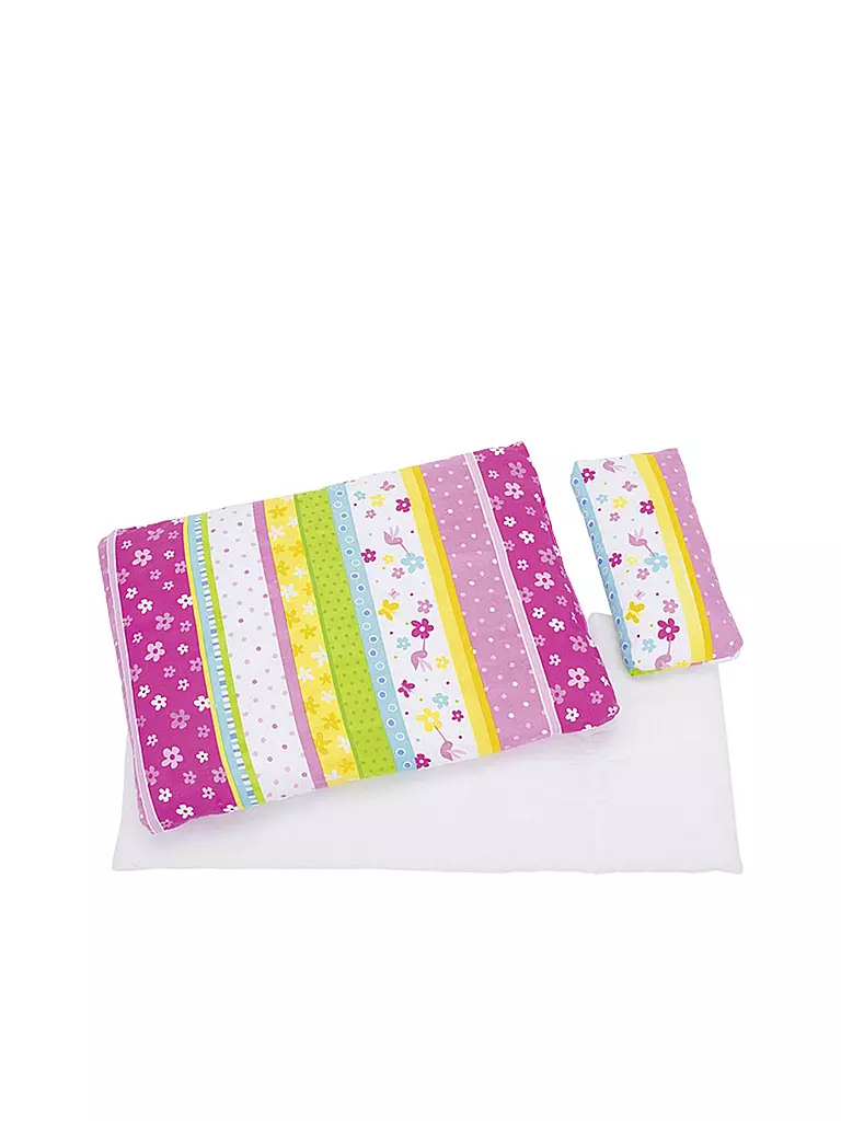 Dieses fröhliche Bettzeug in den typischen Susibelle-Farben passt zu allen goki Puppenbetten und -wiegen.