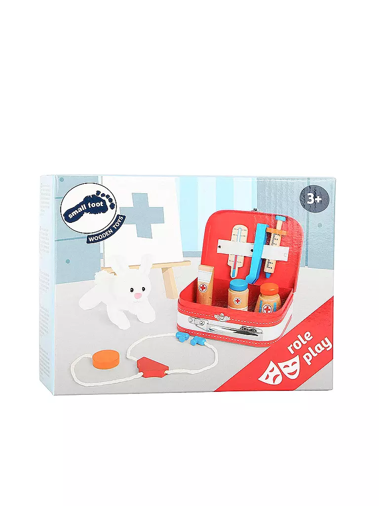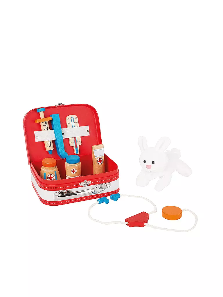 Armes Häschen, bist Du krank? Der praktische Arztkoffer mit jeder Menge Medizin hilft kleinen Hasenkindern und anderen Tieren schnell wieder auf die Pfoten, denn neue Abenteuer warten! Detailreich gestaltet und aus robustem Holz gefertigt sind Spritze, Fieberthermometer, Pinzette, Stethoskop, Salbe und Tabletten die erste Wahl für alle Haseneltern. Und nun: Häschen, hüpf!