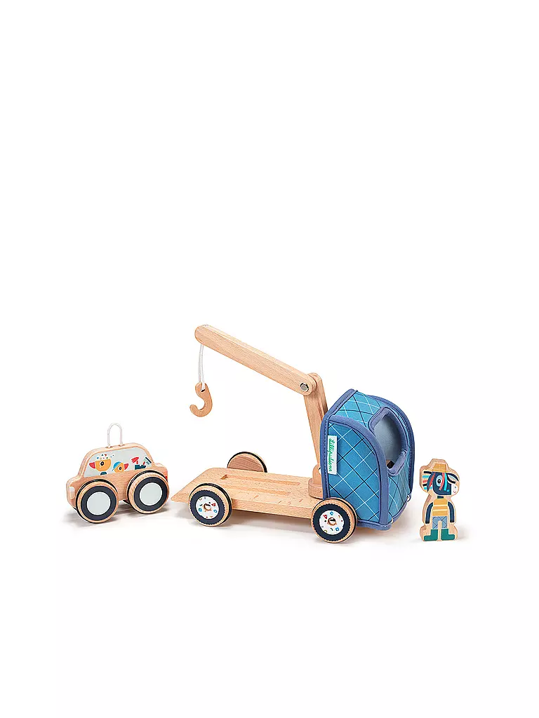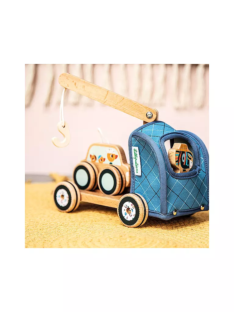 Gaspard das Entlein hat Ärger mit seinem Wagen. Aber keine Sorge. Ignace der Esel kommt mit seinem Abschleppwagen. Uff, jetzt ist Gaspard heil zu Hause angekommen. Und Ignace ist schon wieder auf dem Weg zum nächsten liegengebliebenen Fahrzeug. Der Abschleppwagen aus Holz und Neopren wird ihren Spatz anregen, sich die verrücktesten Abenteuer auszudenken.