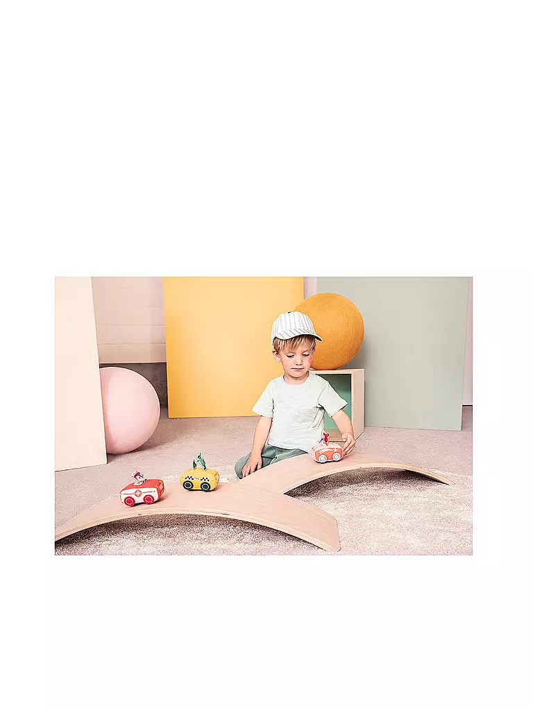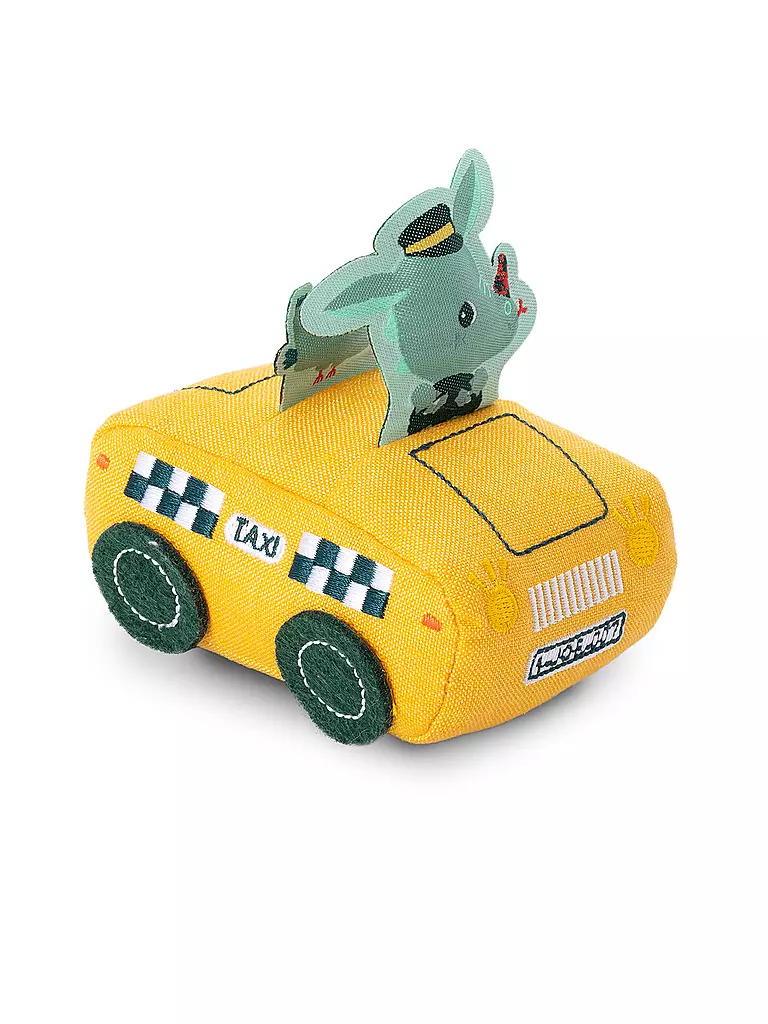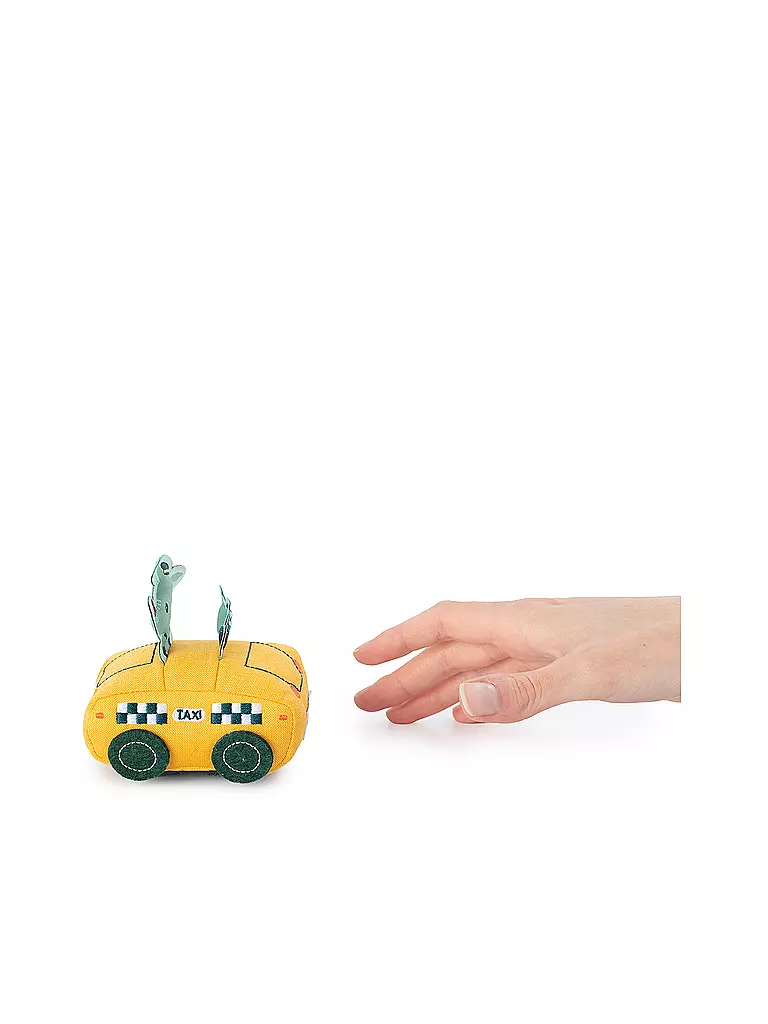 Herr Eule muss zum Flughafen. Joe springt flugs in sein Taxi, um ihn hinzubringen. Dieses weiche Auto ist ideal für kleine Händchen. Einfach ein Stück zurückziehen, und schon fährt das Auto los!