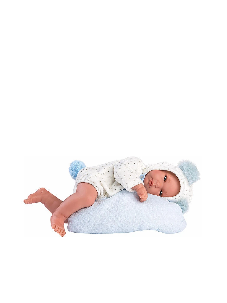 35 cm große New Born Puppe mit blauen Augen und Geschlechtsmerkmal (Junge), komplett aus zartem Vinyl. Er trägt einen weissen Kapuzen-Schlafanzug mit Sternen. Inklusive Schaukelzelt.