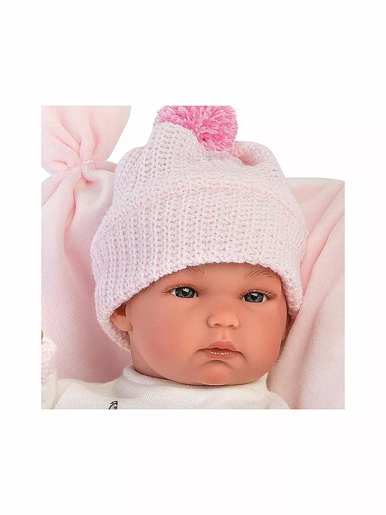 - Die Babypuppe ist in eine rosa Decke gehüllt und trägt ein warmes Babyoutfit und eine Mütze mit Bommel