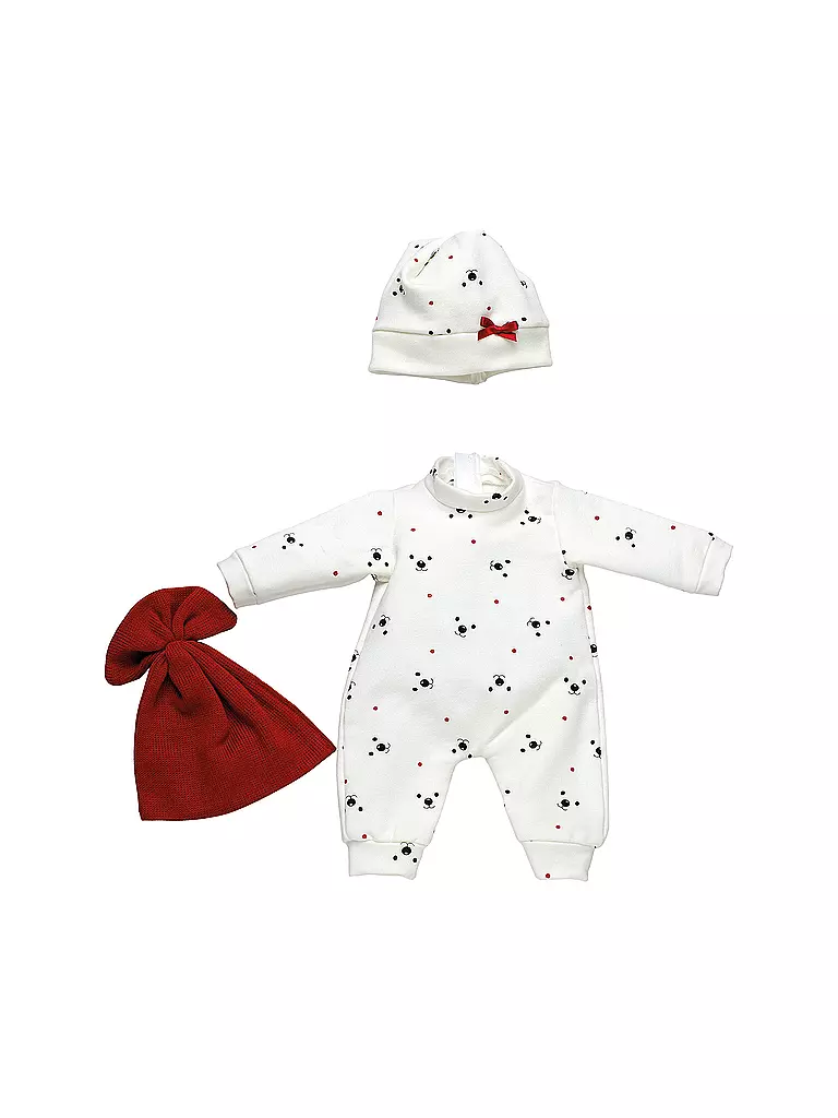Kuscheliges Pyjamaset mit niedlichen Bärengesichtern und roten Punkten kombiniert mit einer Mütze und Kuscheltuch. Das Outfit wird mit einer roten Schleife abgerundet. Passend für Puppen von 35cm – 38cm.
