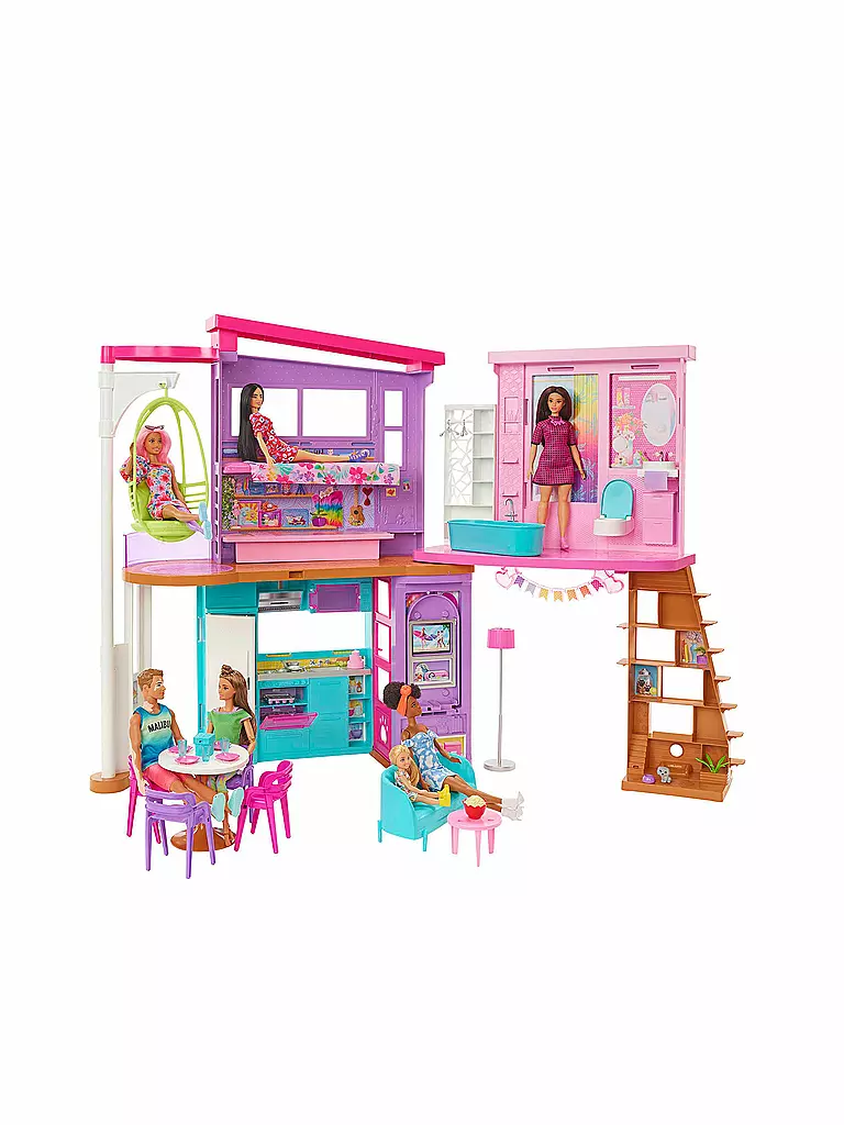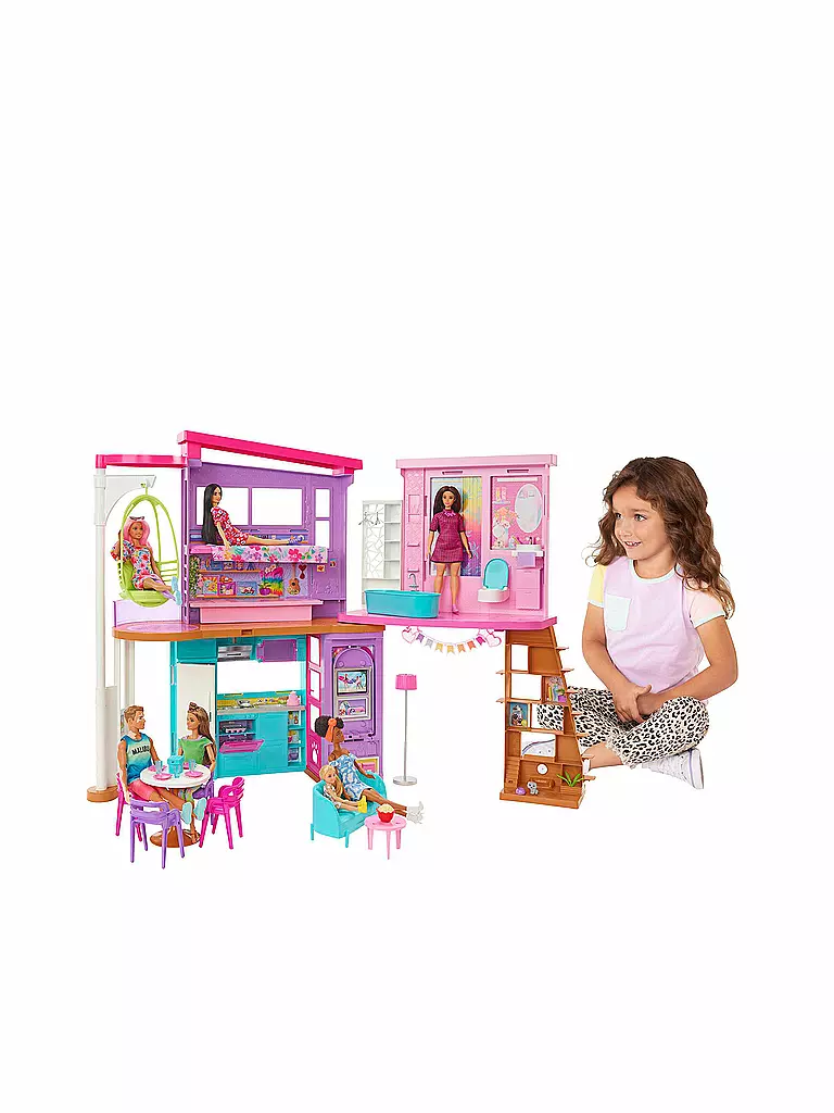 Willkommen im Barbie Malibu Haus! Hier lassen sich auf 2 Ebenen, in 6 Spielbereichen und mit über 30 Teilen zum Geschichtenerzählen endlose Spielmöglichkeiten entdecken – sogar ein Hündchen ist dabei!