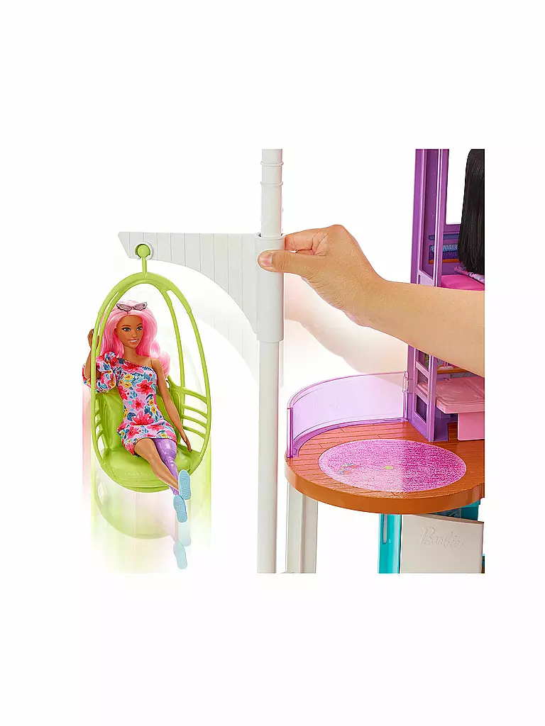 Mit diesem Barbie Malibu Haus Spielset können Kinder ihren Traumurlaub nachspielen. Wer seine Vorstellungskraft in dieses zweistöckige Barbie-Puppenhaus versetzt, kann endlose Spielmöglichkeiten entdecken. Es bietet sechs Spielbereiche, darunter ein Schlafzimmer, ein Badezimmer, eine Küche, ein Esszimmer, ein Wohnzimmer und einen Schrank. Mit diesem Barbie-Haus öffnet sich die Tür zu vielen lustigen Geschichten dank seines modernen, stilvollen Designs und seiner coolen Eigenschaften: etwa ein Schaukelstuhl, der zugleich ein Aufzug ist, und eine Wand, die sich auf und ab bewegt, um den richtigen Ort für einen Filmabend oder eine Geburtstagsparty zu schaffen! Durch die über 30 Teile zum Geschichtenerzählen, darunter ein Hündchen, witzige Möbel und Zubehörteile, ist dieses Barbie Malibu Haus Spielset ein tolles Geschenk für Kinder ab 3 Jahren. Puppen separat erhältlich. Abweichungen in Farbe und Gestaltung vorbehalten.