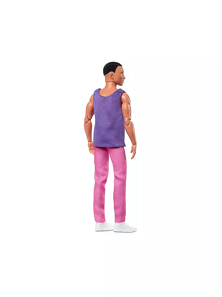 • Die Ken Puppe hat kurz rasiertes schwarzes Haar und ausdefinierte Augenbrauen.