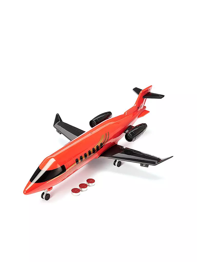 Hochkarätige Stars und wichtige Geschäftsleute genießen den Luxus regelmäßig – für die meisten bleibt es allerdings nur ein sehnsuchtsvoller Wunsch: einmal im Business-Jet fliegen! Losgelöst von festen Flugplänen und Abflugorten startet der nämlich immer dann, wenn er gebraucht wird – das lästige Schlange stehen am Abfertigungsschalter entfällt. Um mit dem modernen Geschäftsflugzeug aus der siku-Flotte abzuheben, muss man es allerdings gar nicht erst in die Liga der Überflieger geschafft haben. Sein Fahrwerk mit gummierten Rädern lässt sich zum Starten und Landen einklappen und ausfahren. Sein Kunststoffrumpf ist rot, Flügel und Leitwerk sind in schwarz gehalten. Das Flugzeug verfügt über sieben LED-Lichter, deren Anordnung und Blinkfrequenz originalgetreu nachempfunden wurden, nämlich: je ein Landescheinwerfer und ein Heck-Positionslicht mit weißer Lichtfarbe, zwei rot blinkende Positionslichter unter und auf dem Flugzeug, ein grünes Positionslicht an der rechten Flügelspitze und ein rotes Positionslicht an der linken Flügelspitze. Damit lässt sich – zumindest im Kinderzimmer – jederzeit frei und spontan abheben! Inklusive 3x LR44 Batterien