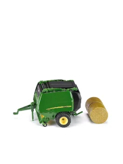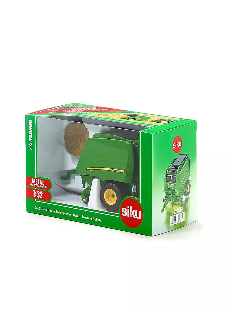 Die preisgekrönte John Deere Ballenpresse des Typs 990 wird von SIKU als hochwertiges und detailgetreues Modell im Maßstab 1:32 umgesetzt. Das Ein-Achs-Fahrwerk ist mit originalgetreuen Reifen und Felgen bestückt. Die Seitenklappen der Maschine sind ebenso wie das Hecktor zum öffnen und geben den Blick auf ein sehr detailliert dargestelltes Innenleben wieder. Pick-Up und Stützfuß sind beweglich und tragen ebenso wie die hochwertige Lackierung und Bedruckung zum außergewöhnlichen Erscheinungsbild dieses Modells bei. Ein Rundballen wird als Zubehör mitgeliefert.