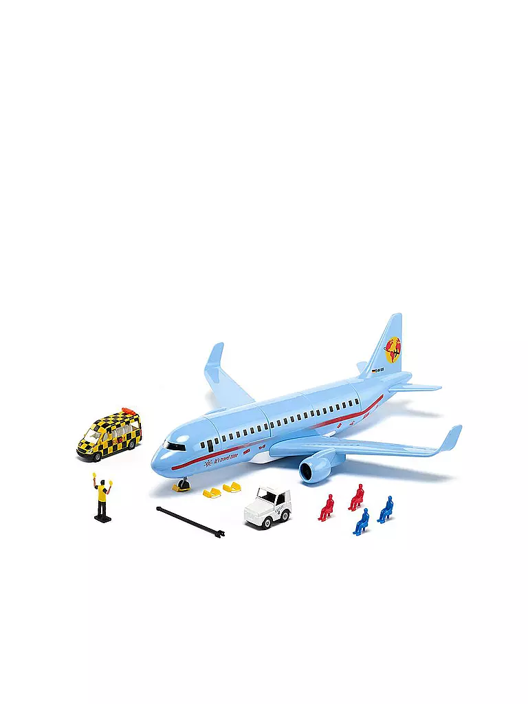 Das große SIKUWORLD Verkehrsflugzeug (38,5 cm) mit den zwei mächtigenTriebwerken steht zum Einsteigen bereit. Doch wer sitzt wo? Das Kabinenpersonal kann einfach die vordere Klappe im Dach anheben und die vier Passagiere ihre Plätzen zuweisen. In der hinteren Klappe ist Platz im Laderaum für das Lieblingsauto, das mit in den Urlaub genommen werden kann. Voller Schub, der Flieger wird schneller und schneller, hebt ab und das Fahrwerk kann eingeklappt werden. Bereit machen zum Landeanflug: Fahrwerk ausklappen und den Landescheinwerfer anmachen. Die LED geht nach zehn Minuten Betriebszeit automatisch aus. Das Flugzeug ist gelandet. Das Follow-me-Fahrzeug begleitet das Flugzeug zur Parkposition. Der Flugzeugschlepper mit der Schleppstange stehen schon für den nächsten Abflug bereit.