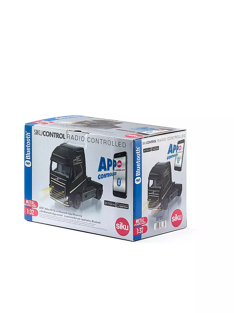 Power, Detailliertheit, hohe Funktionalität – und das alles mit Smartphone oder Tablet zu steuern. Dies bietet der neue SIKUCONTROL Volvo FH16 4×2. Die SIKU APP und die Bluetooth-Technologie machen es möglich. Die vielen Funktionen der Zugmaschine aus Schweden versprechen Spielspaß. Der SIKUCONTROL Truck aus Metall und Kunststoff zeichnet sich nicht nur durch die zahlreichen Features aus, sondern auch durch die bei Fans so geschätzte Detailliebe. Das Fahrerhaus aus Metall ist in Mattschwarz lackiert und aufwändig bedruckt. Alle Funktionen und die zwei Getriebe des Volvo FH16 4×2 werden über die App gesteuert. Wahlweise über die virtuelle Joystick-Steuerung oder die Bewegungs- und Neigungssensoren der mobilen Geräte. Dieses intuitive Feature ist eine willkommene Abwechslung und bietet zusätzlichen Spielspaß. Angetrieben wird der Volvo-Truck über eine Achse. Mit der App ist präzises Rangieren genauso möglich wie das An- und Abkoppeln des 3-Achs-Kippsattelaufliegers (Artikel 6734). Zudem ist in die Zugmaschine eine Datenbuchse integriert, um die Steuerbefehle an den Auflieger weiter zu geben.