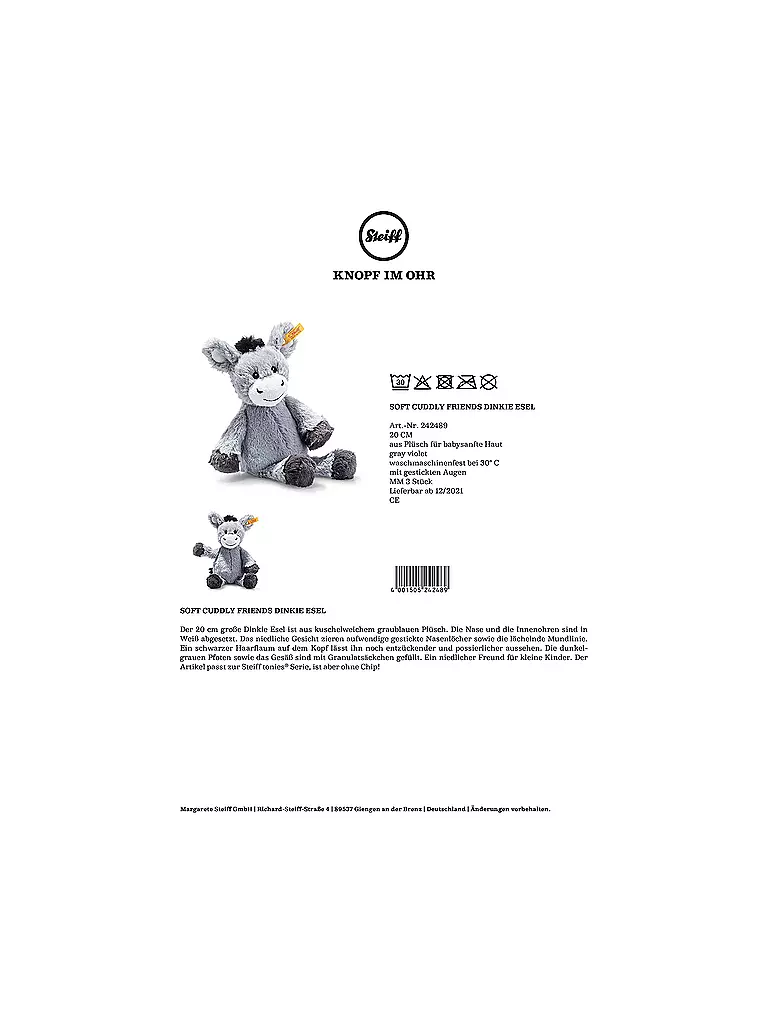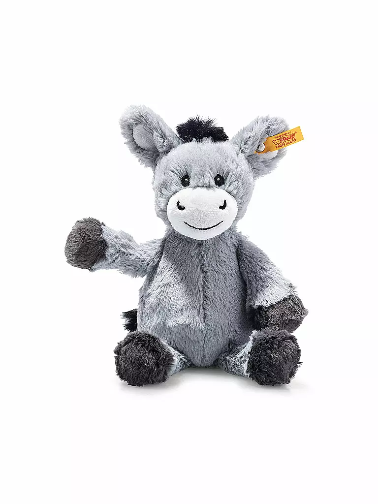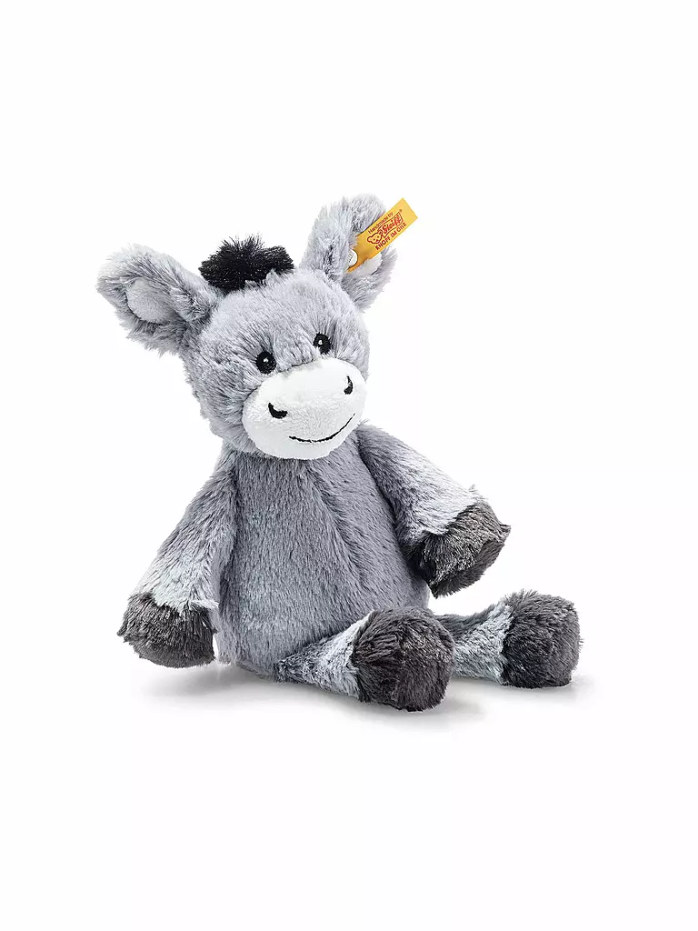 Klug, gesellig und gutmütig, das ist Dinkie Esel aus der Soft Cuddly Friends Familie. Mit seinem sympathischen und liebevollen Gesicht zieht Dinkie alle Blicke auf sich. Der 20 cm große Spielkamerad ist aus kuschelweichem graublauen Plüsch. Die Nase und die Innenohren sind in Weiß abgesetzt. Das niedliche Gesicht zieren aufwendige gestickte Nasenlöcher sowie die lächelnde Mundlinie. Ein schwarzer Haarflaum auf dem Kopf lässt ihn noch entzückender und possierlicher aussehen. Die dunkelgrauen Pfoten sind mit Granulatsäckchen gefüllt. Kleine Kinderhände können sie dadurch gut greifen und festhalten. Im Gesäß ist ebenfalls ein Granulatsäckchen eingenäht. Dieses und auch der Schweif mit schwarzem Puschel sorgen für die perfekte Sitzposition. Nun kann die Spielrunde losgehen. Brauchen die beiden vom vielen Springen und Toben eine Pause, können sie sich zusammen in das weiche Gras legen und kuschelnd den Himmel beobachten. Ein niedlicher neuer Freund für kleine Kinder.