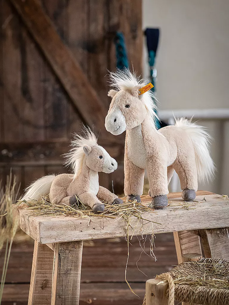 Unsere Soft Cuddly Friends Gola als Schlenker-Pferd mit langen, schlaksigen Beinen, an denen sie sich auch bereitwillig herumtragen lässt. Mit ihrem weichen beigen und weißen Plüsch, wuscheliger Mähne und Schweif und ihrem süßem Gesichtsausdruck macht Gola alle kleinen Pferde-Freundinnen glücklich. 18 cm groß ist das liegende Pferdchen und hat somit genau die richtige Größe, um wirklich überall hin mitgenommen zu werden!