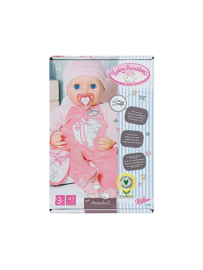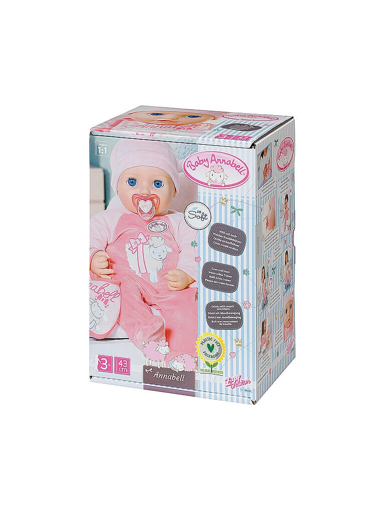 Annabell mit dem weichen Körper, begleitet kleine Puppen-Mamas und -Papas mit lebensechten Funktionen durch den Tag. Am Morgen, gleich nach dem Aufwachen trinkt sie am liebsten Wasser aus der Flasche. Beim Nuckeln bewegt sie ihren Mund und genießt das Frühstück hörbar. Nach dem Trinken noch ein Bäuerchen und schon kann gespielt werden. Annabell lacht begeistert, wenn man mit ihr Hoppe-Hoppe-Reiter spielt. Die Kleine ist auch super kitzelig. Sie kichert fröhlich, wenn man sie am Bauch kitzelt. Manchmal rutscht ihr dabei sogar ein kleiner Pups heraus. „Ups! – Kicher!“ Auch das fröhlichste Puppenkind hat mal schlechte Laune. Dann schluchzt Annabell und weint echte Puppentränen. Sie lässt sich aber schnell wieder durch alle möglichen Aktivitäten beruhigen. Hoch im Kurs steht der Schnuller, an dem sie mit Mundbewegungen und Geräuschen nuckelt. Zur Gute-Nacht-Zeit wird sie vorwärts, rückwärts, seitwärts in den Schlaf geschaukelt. Dabei gähnt sie ausgiebig, schließt die Schlafaugen und schlummert mit tiefen Atemzügen.