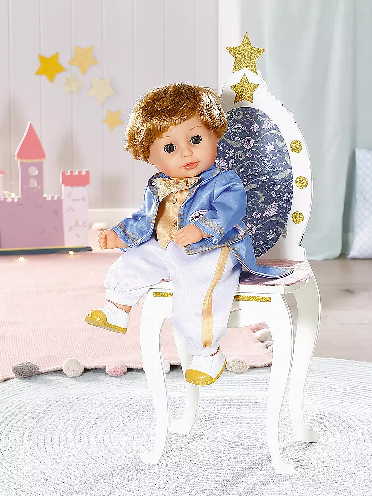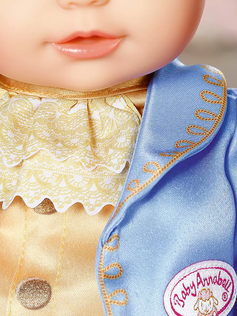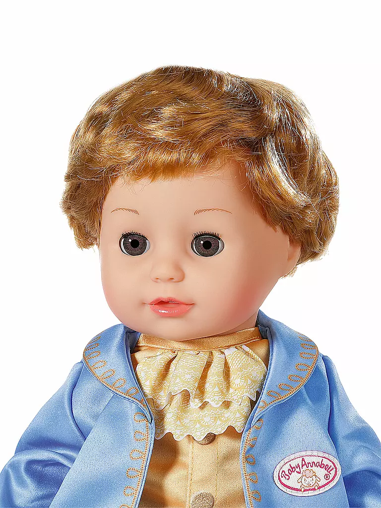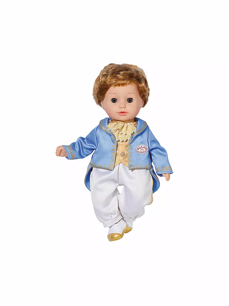 Mit dem kleinen süßen Prinzen hat Prinzessin Annabell endlich einen Partner zum Üben des Königswalzers gefunden. Der 36cm große Junge trägt weiß-goldene Schuhe, mit denen er eine flotte Sohle aufs Parkett legen kann. Die weiße Hose ist seitlich mit einem aerodynamischen Goldstreifen bedruckt. Sein Oberteil ist ein 2in1 aus goldener Weste und royal-blauer Jacke mit angenähtem Spitzenlatz. Das Outfit ist im easy fit Style gefertigt und kann sogar von kleinsten Kinderhänden einfach an- und ausgezogen werden. Die qualitativ hochwertigen Haare sitzen auch bei den wildesten Drehungen perfekt auf seinem Kopf aus Vinyl. Nach der Tanzstunde macht der kleine Prinz immer ein Nickerchen und träumt vom nächsten Ball auf Schloss Babylon. Wenn man den Süßen mit dem weichen Stoffkörper auf den Rücken legt, schließt er die Schafaugen.