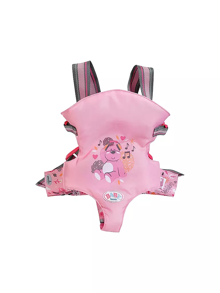 Die Innenseite und der Hüftgurt der Trage sind mit süßen Grafiken bedruckt. Auf dem rosa Außenstoff sitzt Bär Bruno genauso entspannt wie BABY born innen drin. Dank des verstellbaren Gurtsystem können sich Mama und Papa immer mal mit dem Tragen abwechseln.