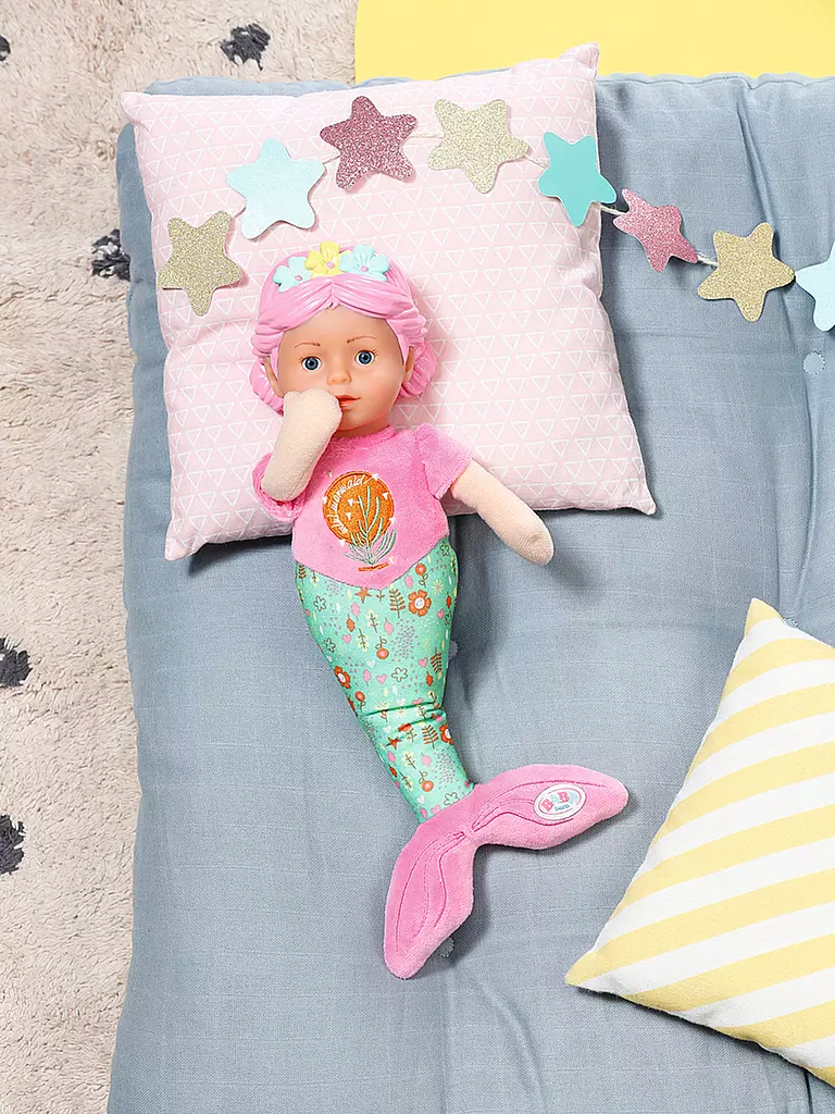 Wer steigt denn da fröhlich aus dem Kissen-Meer empor? Die kuschelige Meerjungfrau hat einen weichen Stoffkörper. Das Oberteil mit Algenstickerei und die rosa Flossen sind aus dem gleichen plüschigen Stoff. Der türkise Schwanz ist mit natürlichen Drucken versehen. Ihr softer Kopf aus Vinyl ist mit pinken Haaren verziert. Die Zöpfe erinnern an Seeigel. Einige blühende Wasserpflanzen haben sich als Blumenkranz in der Frisur verfangen. Und falls die Meerjungfrau mal einen Tauchgang in der Abendmilch gemacht hat, kann sie problemlos bei 30°C gewaschen werden.